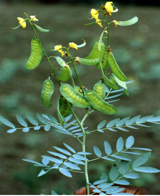 A variable, branching, erect shrub growing up to 1.8 m height. Leaves pinnate and pubescent with 3–9 pairs of pale to bluish-green lanceolate or elliptic leaflets (1.5–5.0 cm long). Flowers brilliant yellow in erect terminal racemes. Pods flat, thin, oblong, light green when young turning dark brown or black at maturity. Seeds dark brown, obovate-oblong (5–7 per pod).